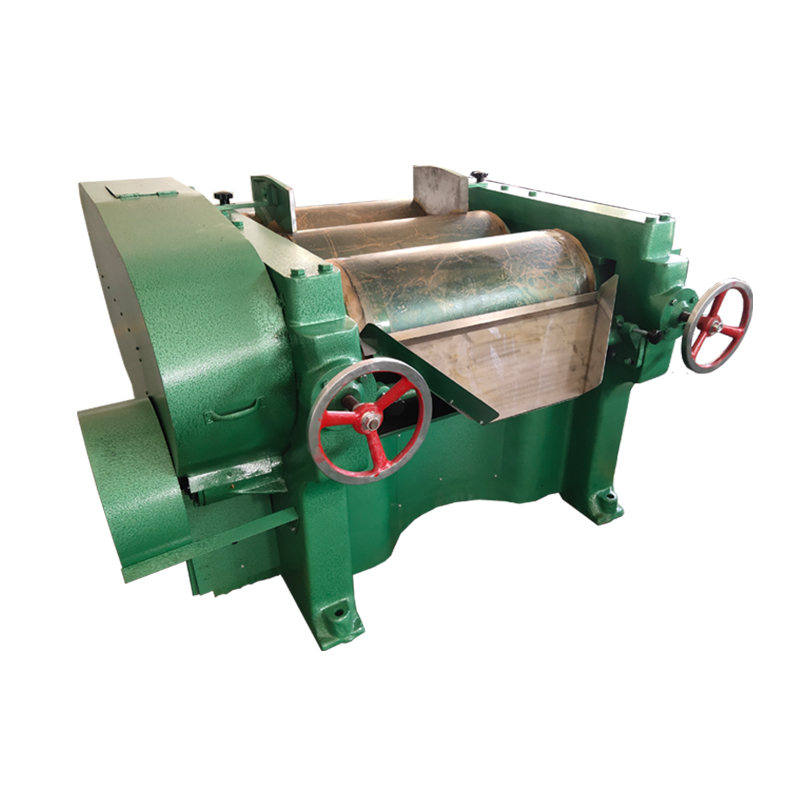 工作時將快、慢輥調(diào)節(jié)到適當位置,啟動機器,然后將需研磨的漿料加入中輥與慢輥之間銅刀處,漿料經(jīng)過中、慢輥表面研磨后,由中輥帶給快輥,再由緊貼表面的出料刮刀予以刮下,通過裝有擋板的刀板,流入盛料筒,由此構成整個研磨過程。