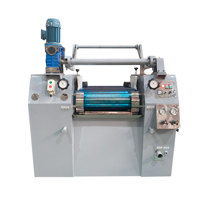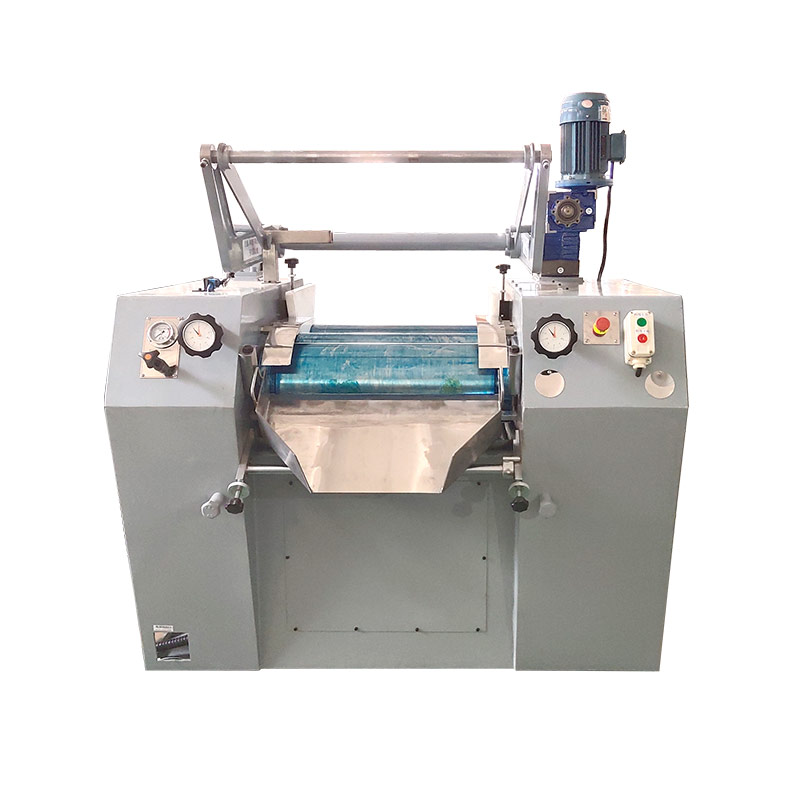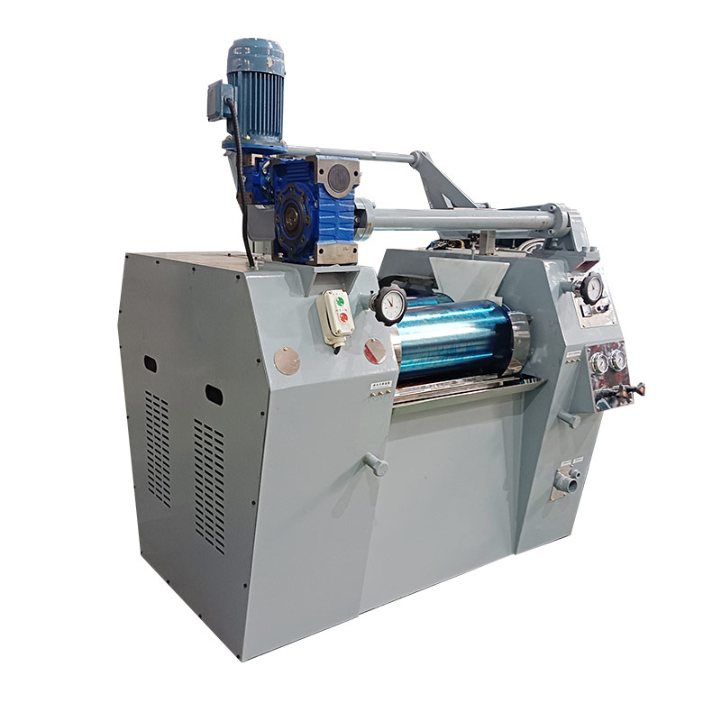 加料裝置把所需研磨的物料倒入慢輥與中輥進行第一次擠壓研磨,再轉(zhuǎn)入與快輥作第二次研磨,經(jīng)二次研磨后,由出料刀片鏟下,完成一個工作過程。物料在三根輥筒之間多次地被混合、研磨從而達到物料的細度等要求。研磨的次數(shù)與細度,一般與物料的質(zhì)量與前道工序的好壞有直接的關聯(lián)。