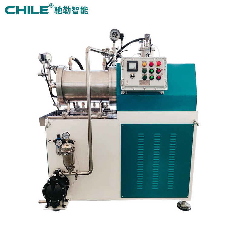 利用料泵將經過攪拌機預分散潤濕處理后的固-液相混合物料輸入筒體內,物料和筒體內的研磨介質一起被高速旋轉的分散器攪動,從而使物料中的固體 微粒和研磨介質相互間產生更加強烈的碰撞、摩擦、剪切作用,達到加快磨細微粒和分散聚集體的目的。研磨分散后的物料經過動態分離器分離研磨介質,從出料管流出。臥式砂磨機特別適合分散研磨粘度高而粒度要求細的產品。