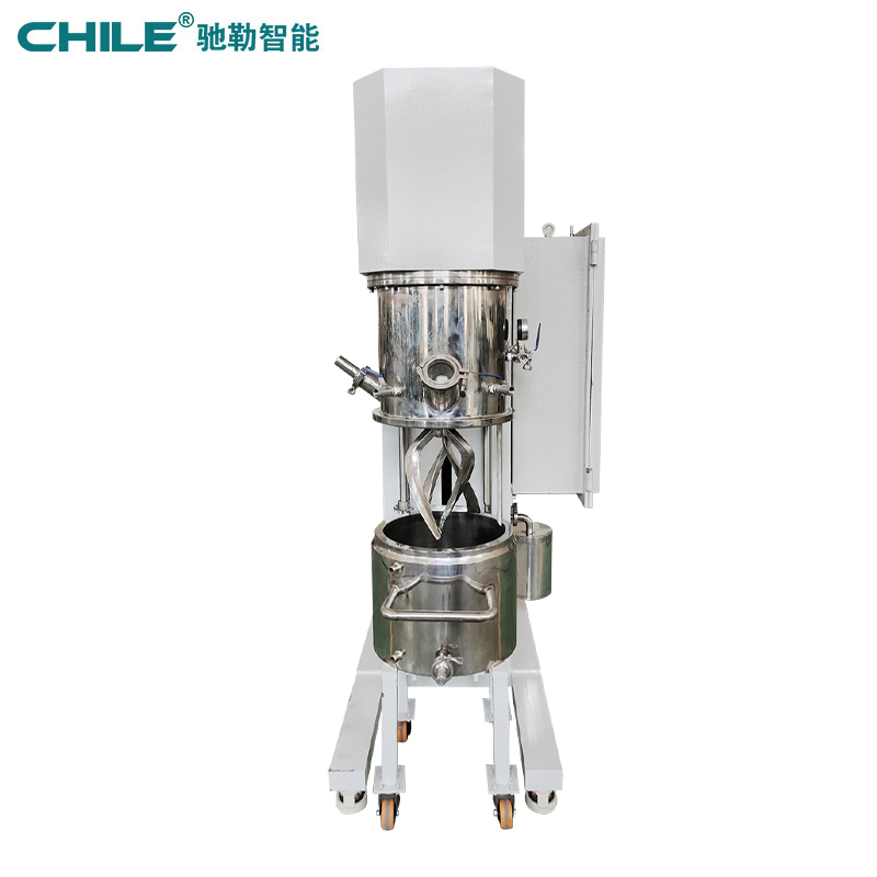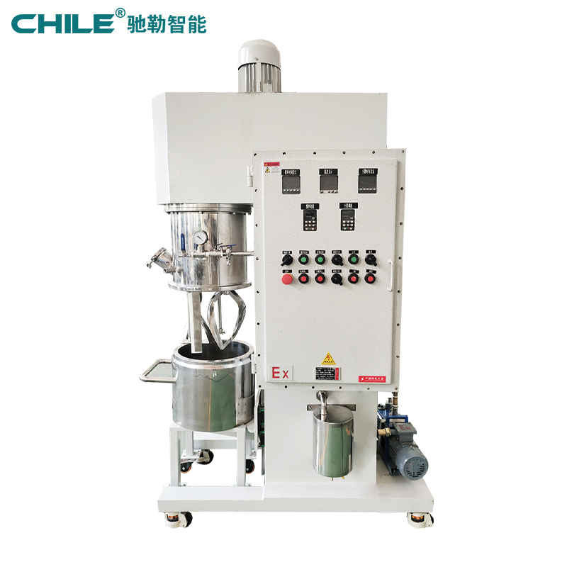 雙行星真空攪拌機是一種高性能、高效率、易清洗維護的新型攪拌設備。主要由減速電機、行星架、攪拌器、分散器、刮壁器、料桶、升降系統、液壓擠出系統以及機架等構成,設備的雙組攪拌器運行時自轉同時繞著軸心進行公轉,攪拌器形式根據物料粘度和工藝特性選配,常見的包括漿葉式、麻花式、爪式、框式等,具備良好的混合、反應、捏合、溶解的作用;高速分散器由多層具備極高線速度的鋸齒狀分散盤組成,它同樣在高速自轉的同時繞著軸心進行公轉,能夠將粉料(助劑)快速的分散到漿料里,具備很強的分散作用。設備配有一組獨立刮刀,對桶壁進行不斷的刮拭,同時攪拌漿葉可以增加刮片,對料桶底部進行刮拭,避免攪拌死角,確保產品的穩定性;雙行星直空攪拌機傳動采用行星齒輪傳動,有較大的輸出扭矩,適用干高溫、高固,高粘度等高難度工況;該設備采用密閉式設計,可以配合直空系統,實現直空攪拌,攪拌桶也可設計帶夾套加熱,配合模溫機,實現恒溫攪拌功能,是市場上針對高粘度物料的分散、攪拌設備。