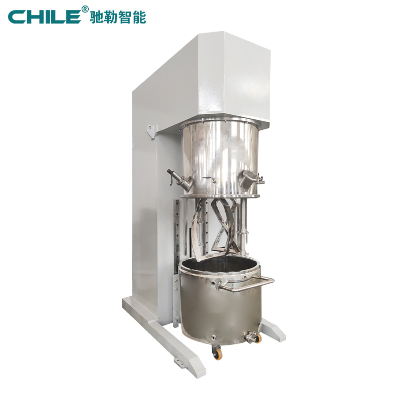 雙行星真空攪拌機是一種高性能、高效率、易清洗維護的新型攪拌設(shè)備。主要由減速電機、行星架、攪拌器、分散器、刮壁器、料桶、升降系統(tǒng)、液壓擠出系統(tǒng)以及機架等構(gòu)成,設(shè)備的雙組攪拌器運行時自轉(zhuǎn)同時繞著軸心進行公轉(zhuǎn),攪拌器形式根據(jù)物料粘度和工藝特性選配,常見的包括漿葉式、麻花式、爪式、框式等,具備良好的混合、反應(yīng)、捏合、溶解的作用;高速分散器由多層具備極高線速度的鋸齒狀分散盤組成,它同樣在高速自轉(zhuǎn)的同時繞著軸心進行公轉(zhuǎn),能夠?qū)⒎哿?助劑)快速的分散到漿料里,具備很強的分散作用。設(shè)備配有一組獨立刮刀,對桶壁進行不斷的刮拭,同時攪拌漿葉可以增加刮片,對料桶底部進行刮拭,避免攪拌死角,確保產(chǎn)品的穩(wěn)定性;雙行星直空攪拌機傳動采用行星齒輪傳動,有較大的輸出扭矩,適用干高溫、高固,高粘度等高難度工況;該設(shè)備采用密閉式設(shè)計,可以配合直空系統(tǒng),實現(xiàn)直空攪拌,攪拌桶也可設(shè)計帶夾套加熱,配合模溫機,實現(xiàn)恒溫攪拌功能,是市場上針對高粘度物料的分散、攪拌設(shè)備。